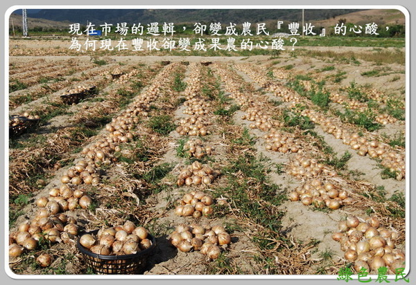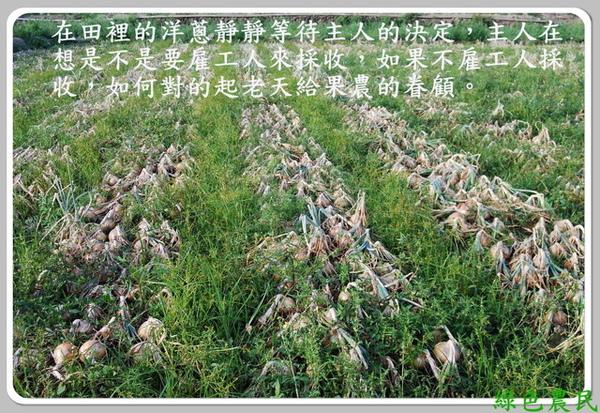 去年香蕉滯銷,許多農民心淌著血,含悲砍除大量的香蕉,今年香蕉價格飛漲卻苦無香蕉可出。同樣的事再度上演,南部恆春半島的洋蔥農,正被『豐收』折騰著。他們心裡爭扎著的是:還依娓著土地的飽滿洋蔥要不要雇工採收,多採收一袋就要多賠上一些血本。但是不採收,如何對得起老天給的『豐收』?