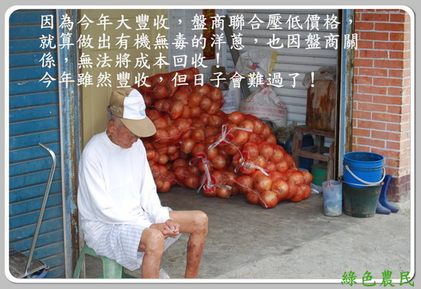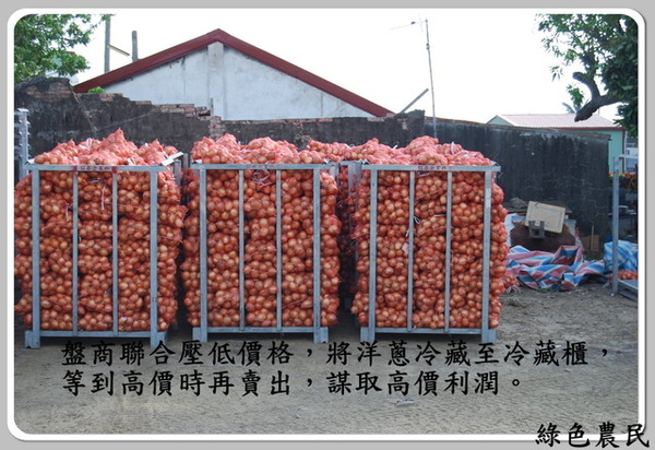 蔥農心裡都知道,盤商與行口正趁著豐收聯手壓低價格,他們將洋蔥放入冰庫冷藏,等著颱風季節再釋出,好謀取高價。但是我們的農民對於這種市場性格卻毫無辦法,只有任其宰割。