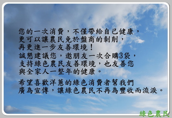 但是,我想綠色消費者應該和我們一樣,無法接受這樣的事繼續演變下去,因為這是以消費者力量來捍衛食品安全與環境健康的時代了。因此我們呼籲綠色消費者,協助我們的綠色農民,讓他們還能有力氣為我們守護土地與健康。邀請你的朋友來支持他們,免除他們被剝削的命運。