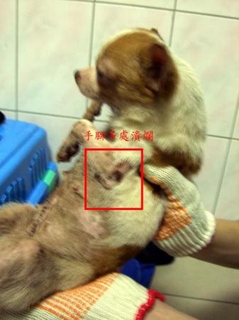 仔細一看,吉娃娃"啾啾"胸口已經潰爛深可見骨,腿部也多處受傷