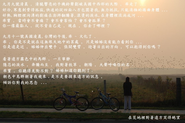 九月九號清晨, 清脆響亮的手機鈴聲劃破美國中西部的天際, 讓半夢半醒的我立即清醒, 顫抖的從哥手中接過電話.