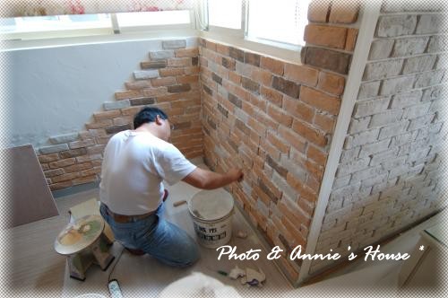 我還一邊拿布故意把白水泥抹到文化石上的毛細孔上