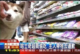 一隻哈士奇狗闖進台中縣龍井鄉的超商,偷吃巧克力蛋,